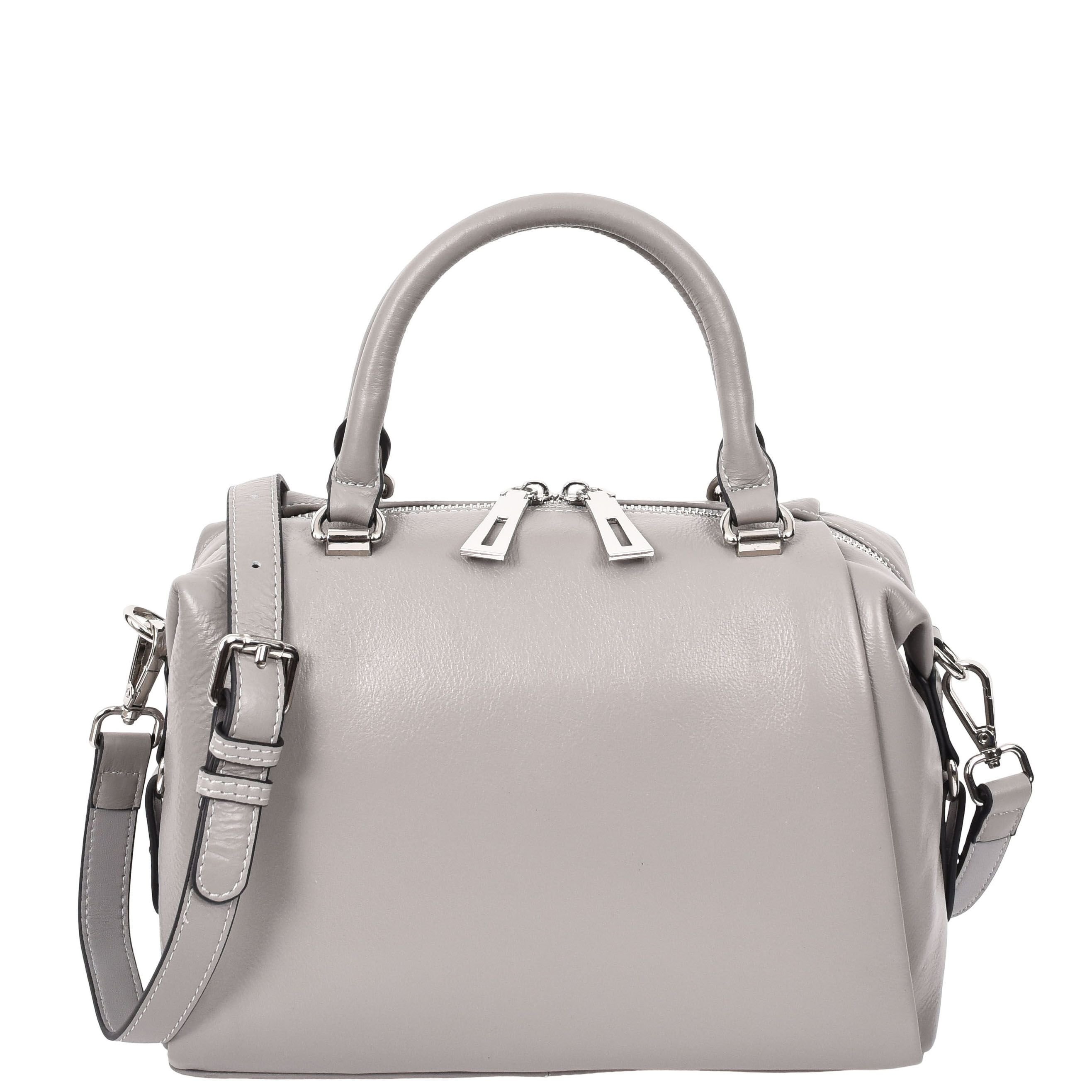 Elegant grey real leather handbag with a classic design. Features two carry handles, detachable shoulder strap, and a zipper closure. Perfect for any occasion.