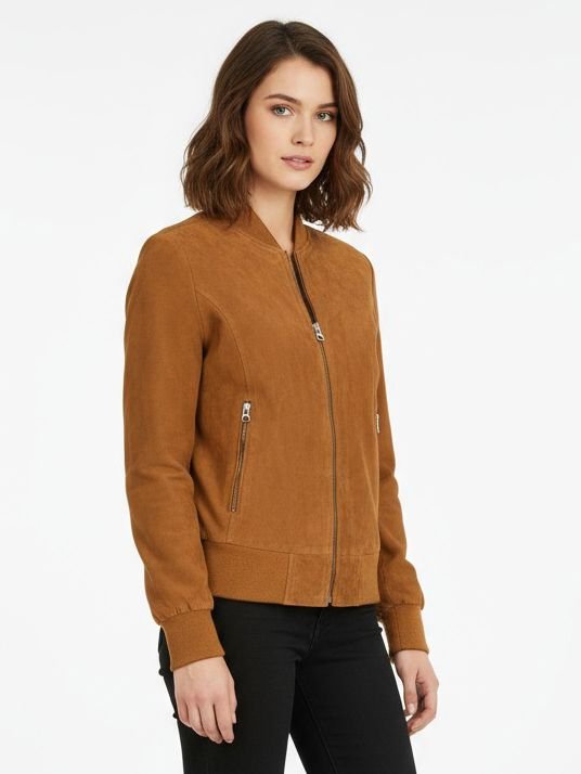 Stylish bomber jacket in tan suede with a classic fit. Features a ribbed collar, cuffs, and hem for a snug fit, along with a sturdy front zipper closure and two zippered side pockets. Perfect for layering over casual outfits.
