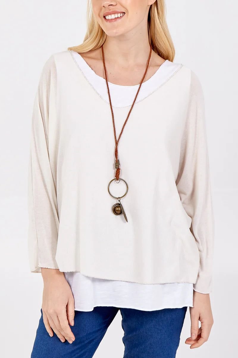 The HOXTON GAL Beige Oversized Long Sleeve Blouse With Necklace is available in sizes ONE SIZE.