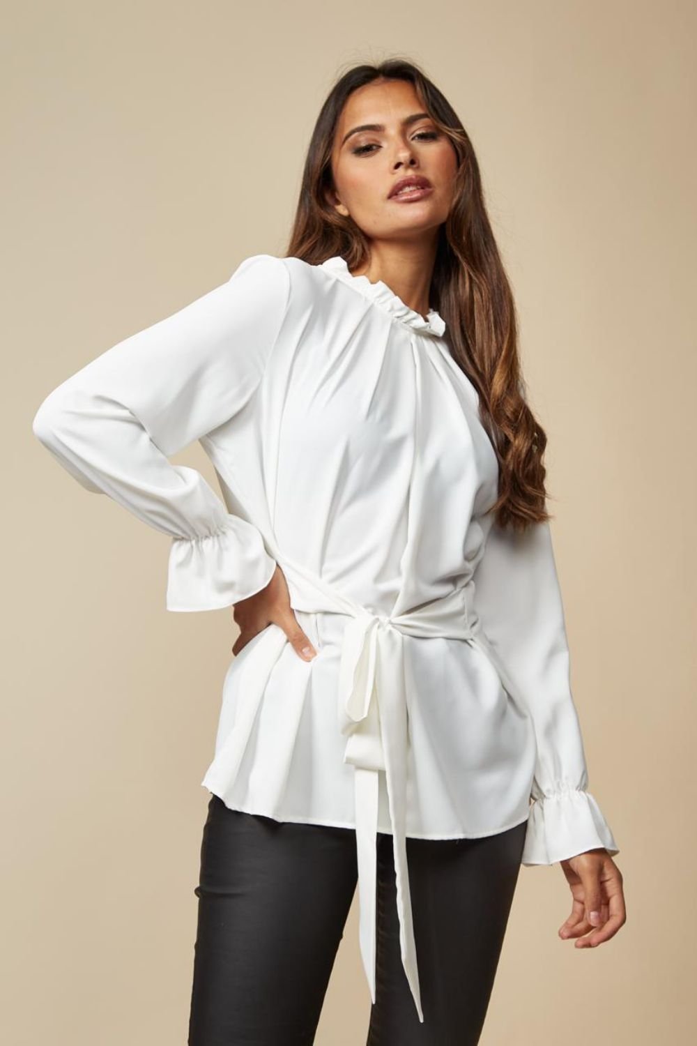 Elegant white blouse with a tie ruffle neckline and tie waist detail. Made from silk-like fabric for a luxurious feel. Ideal for both day and night wear.