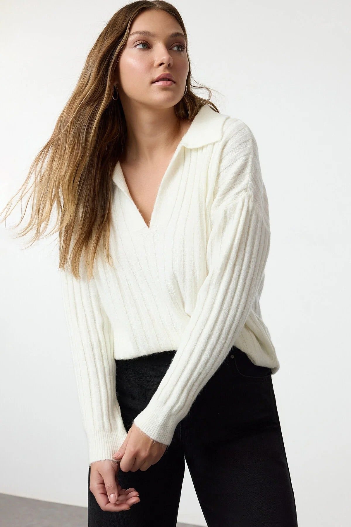Embrace understated luxury with this soft-textured white ribbed knit sweater. Crafted for comfort and style, its oversize fit offers relaxed sophistication while the polo collar provides warmth and a refined silhouette. Ideal for layering or wearing alone, this versatile knit enhances your wardrobe.