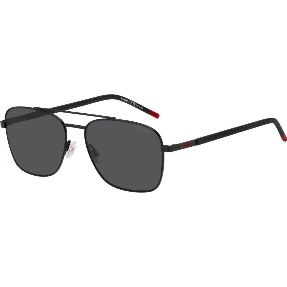 Stylish square/rectangle sunglasses from HUGO in sleek black with red accents. Featuring dark grey polarized lenses, these sunglasses offer both fashion and function.