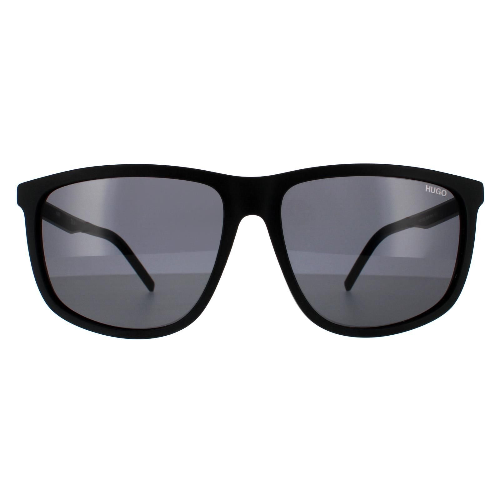 Classic rectangle sunglasses in matte black with grey lenses. Featuring a lightweight plastic front and flat metal temples with rubberised inserts. Subtle Hugo branding on the temples.