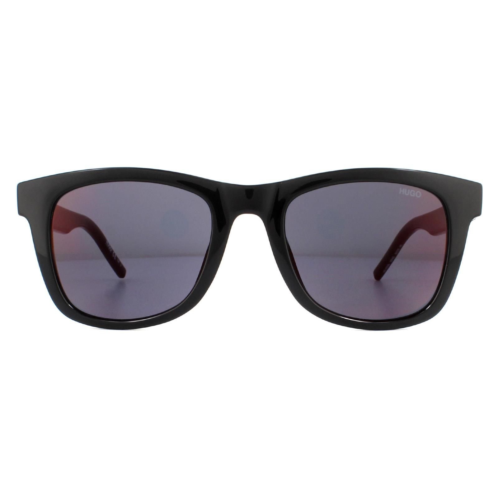 Modern rectangle sunglasses with shiny black frames and red mirror lenses. Hugo branding on the temples ensures a stylish and authentic look.