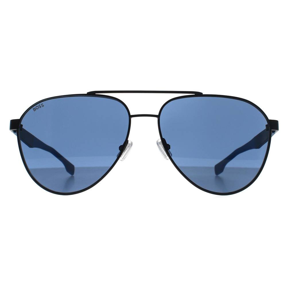 Sleek matte black aviator sunglasses with blue lenses from Hugo Boss. Designed for a contemporary look with a functional design, these sunglasses feature a lightweight yet durable acetate frame and polished metal detailing. The signature BOSS logo adds a refined, high-fashion touch.