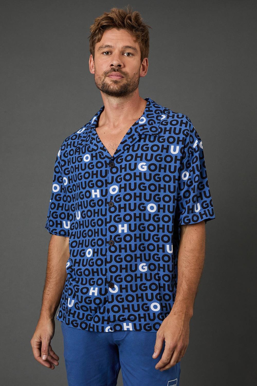Bold all-over HUGO logo print creates a distinctive statement look. Relaxed camp collar design offers a laid-back summer aesthetic. Short sleeves with clean-finished edges for comfort and ease of movement. Button-through front closure for versatile styling options.
