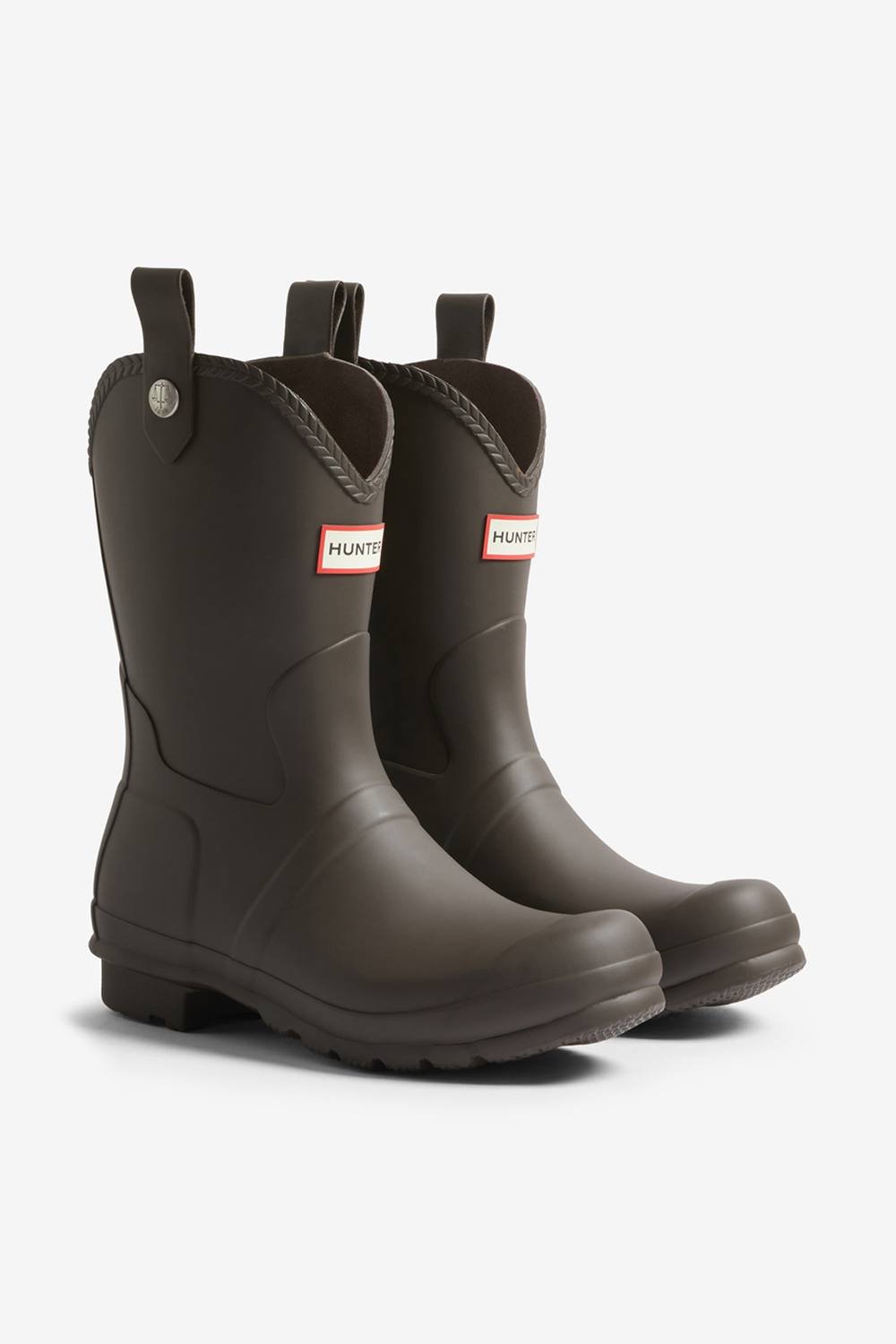 Iconic Hunter Original Cowboy Boot in brown with a distinctive pull-on style. Durable waterproof construction ideal for British weather conditions. Features braided trim detailing around the boot opening and a branded Hunter logo patch on the front. Equipped with a sturdy grip sole.
