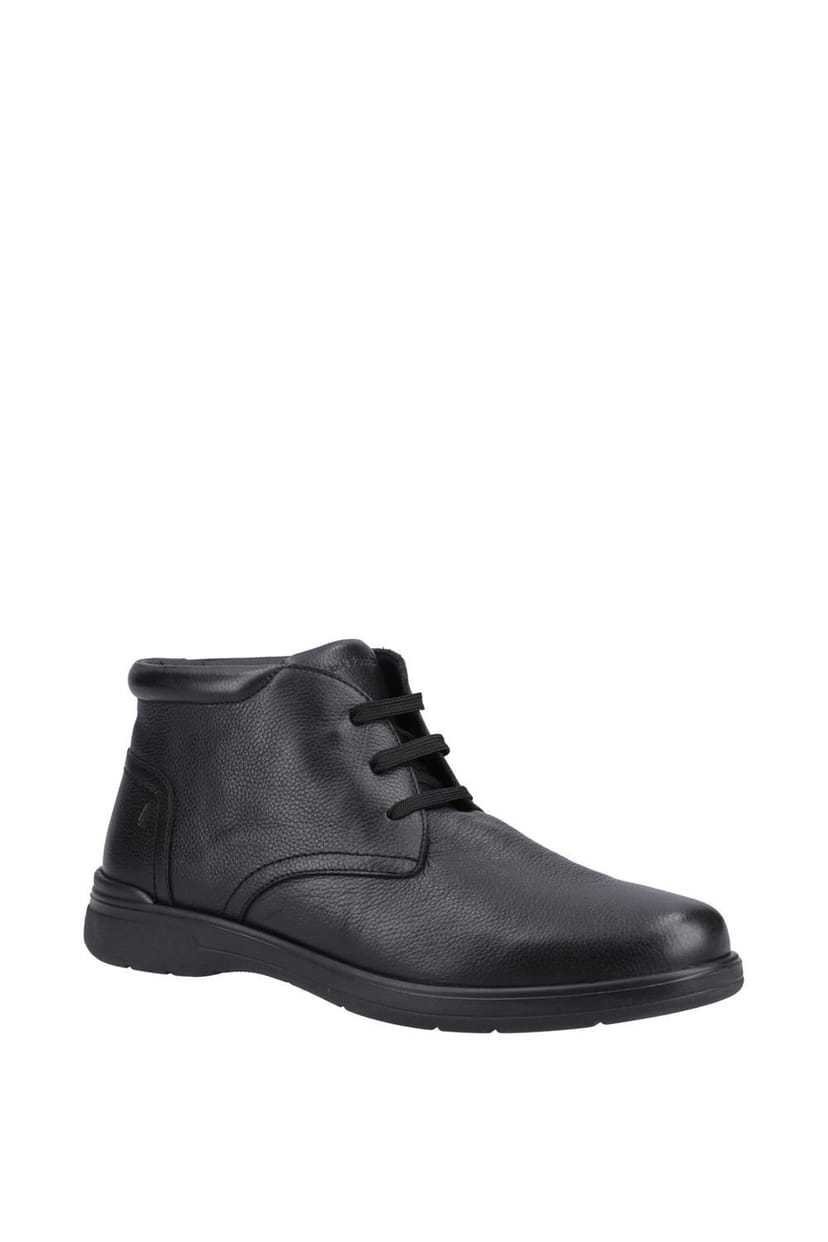 Classic Hush Puppies Malcolm Chukka boots in black leather with a padded collar and soft lining for all-day comfort. Perfect for casual winter days.