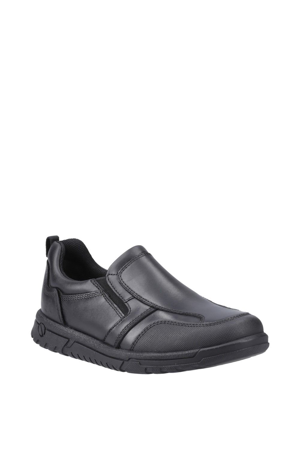 Stylish black leather slip-on shoe with a padded collar for comfort. Features a textured toe guard and a hardwearing outsole for durability. Perfect for everyday wear.