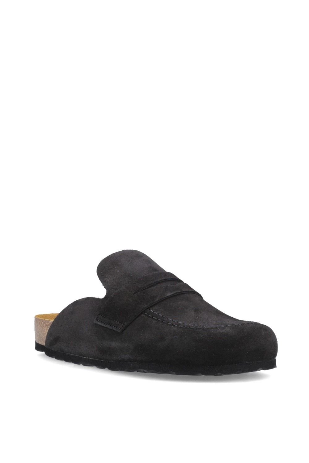Stylish black suede mule sandal by Hush Puppies. Features a closed toe design with a cork sole and contoured footbed for comfort. Perfect for summer wear.