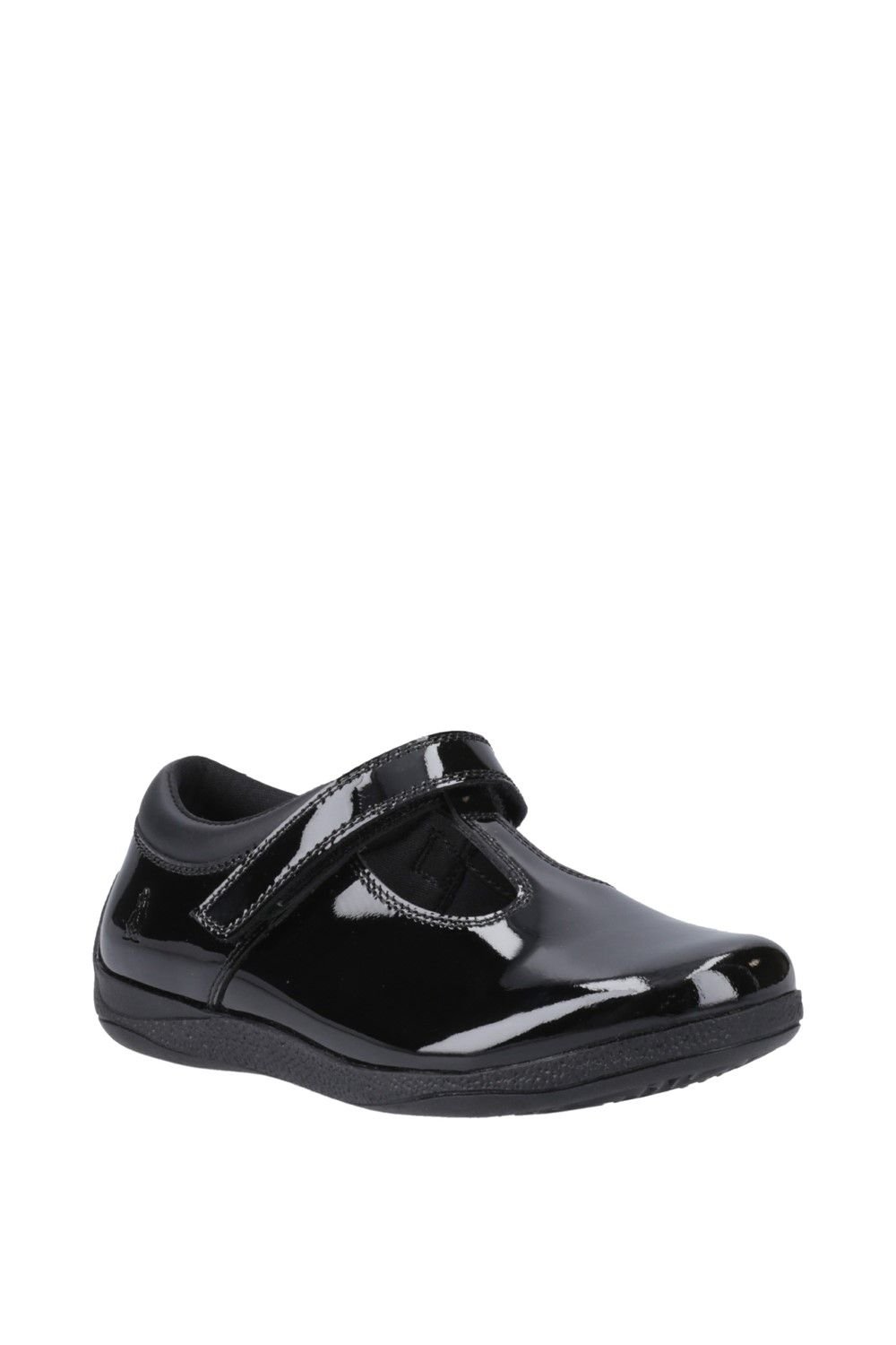 Classic Hush Puppies Caitlin T-Bar shoe in patent leather with a sleek design. Features a touch fastening detail for easy wear and Custom Fit insoles for added comfort. Perfect for everyday school wear.