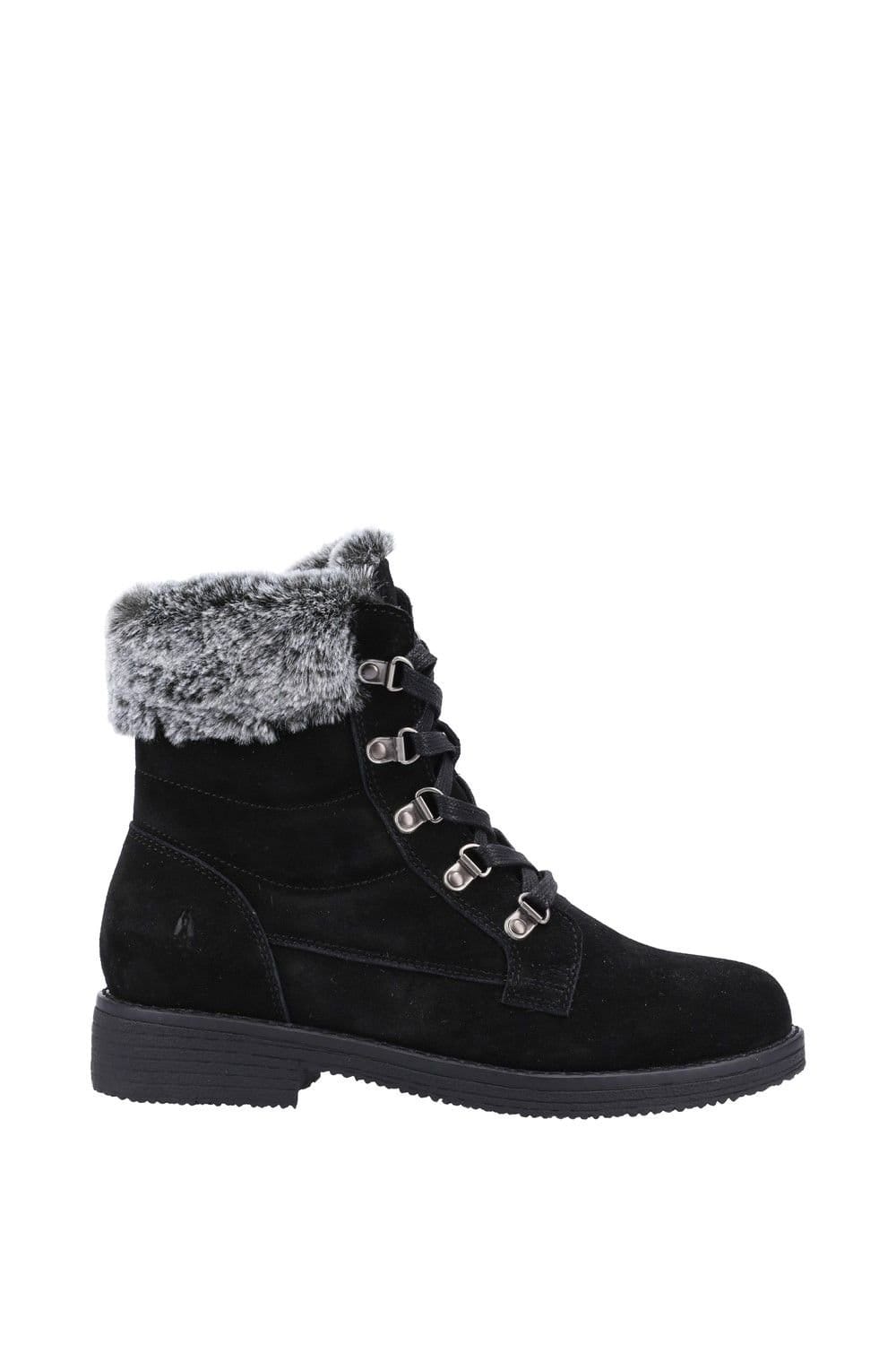 The Hush Puppies Black Mid Boot with Faux Fur Collar is made from suede, fleece.