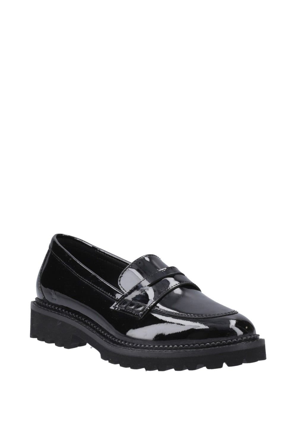 Stylish Hush Puppies loafer in black patent leather with a 20mm heel and flexible EVA outsole. Easy slip-on design perfect for back-to-school or casual wear.