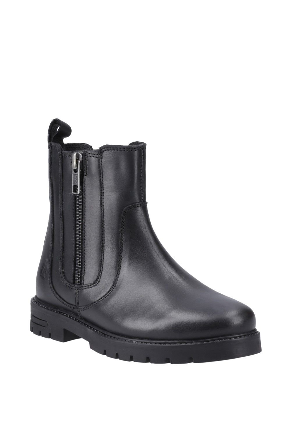 Stylish black leather ankle boot with a chunky sole and side zip fastening. Designed for both style and comfort, featuring Custom Fit insoles and three different width insoles.
