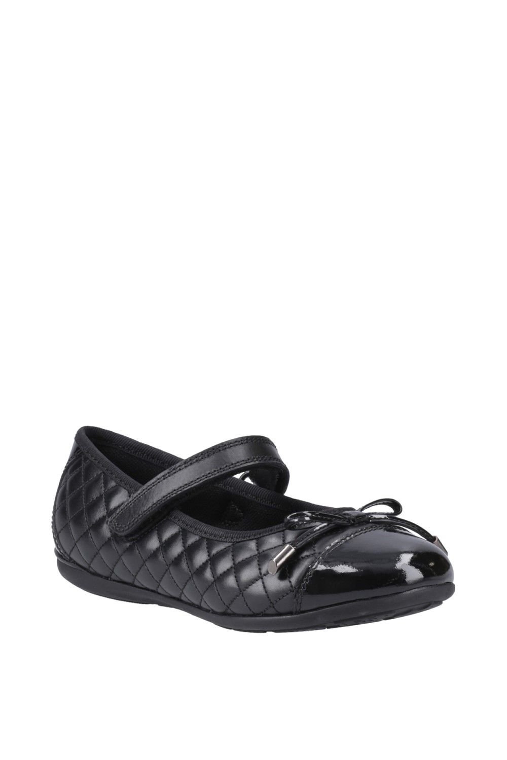 Stylish black quilted ballerina shoe with a soft leather upper, bow detail, and touch fastening. Perfect for school or casual wear.