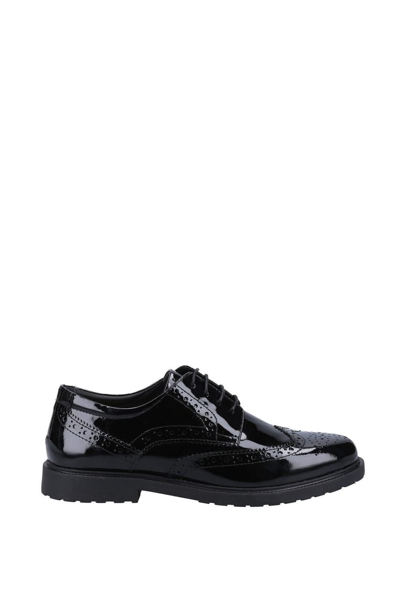 Classic Hush Puppies Verity Brogue shoe in black patent leather with a brogue detailing and lace-up fastening. Ideal for back-to-school or everyday wear.