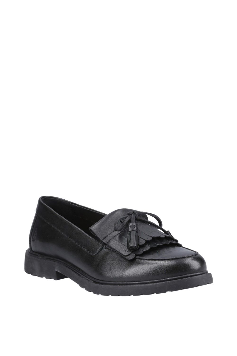 The Hush Puppies Women's Verity Kiltie Loafer in Black is made from leather, polyurethane.
