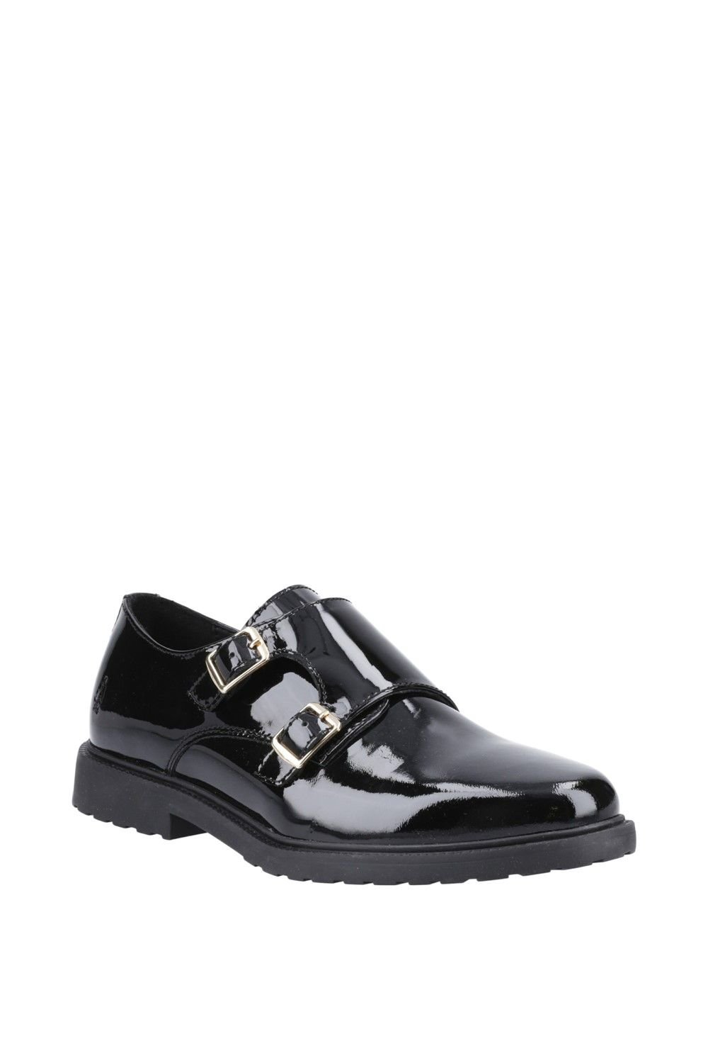 The Hush Puppies Women's Verity Monk Shoe in Black is made from patent leather, rubber.