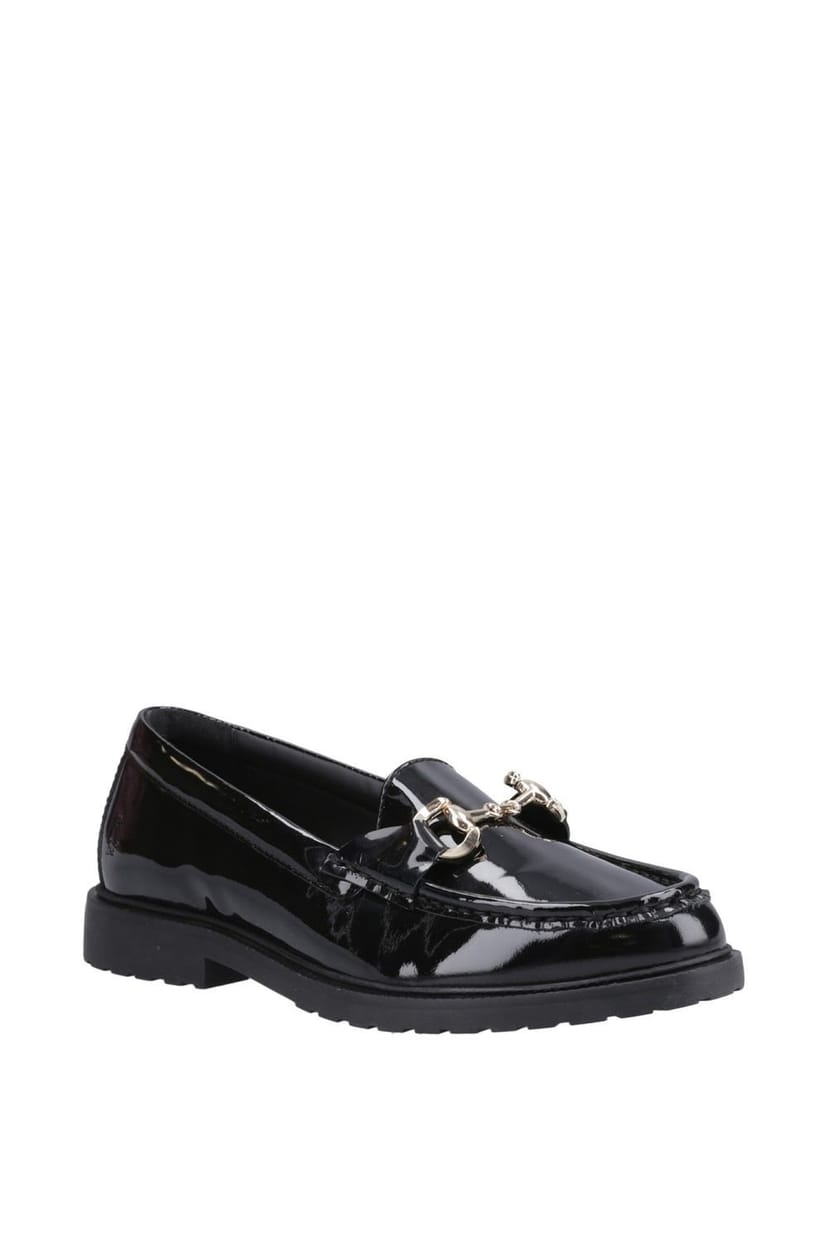 Stylish black patent loafer with a snaffle detail and comfortable insole. Perfect for everyday casual wear.