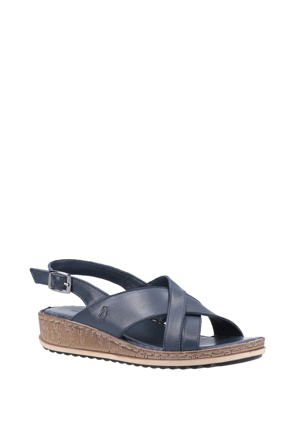 Stylish Navy leather crossover wedge sandal from Hush Puppies. Features a soft leather lining and an extra padded leather sock for comfort. Ideal for casual outings.