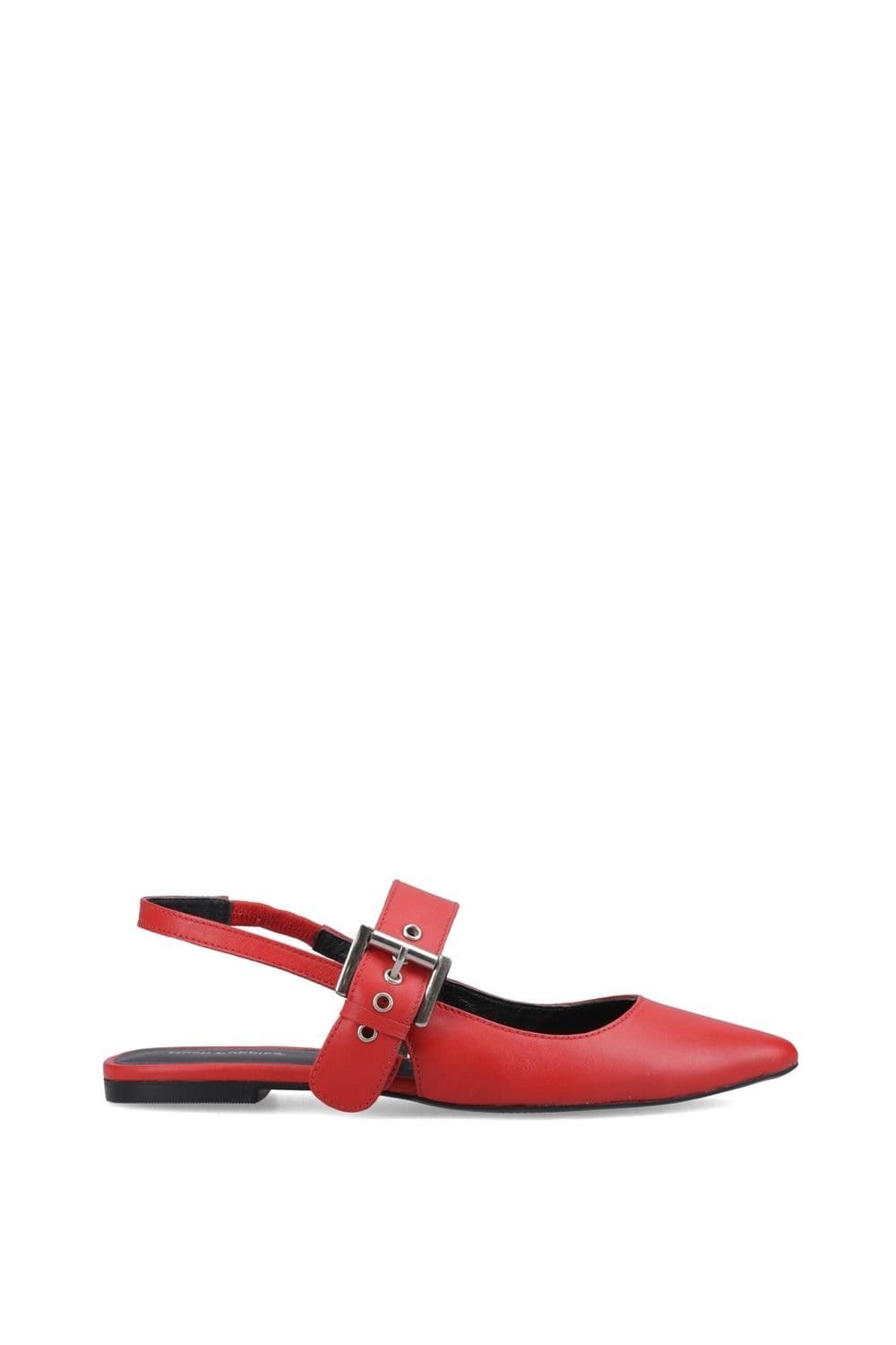 Elegant red leather Mary Jane shoes with a buckle strap and pointed toe. Designed for all-day comfort and a timeless look.