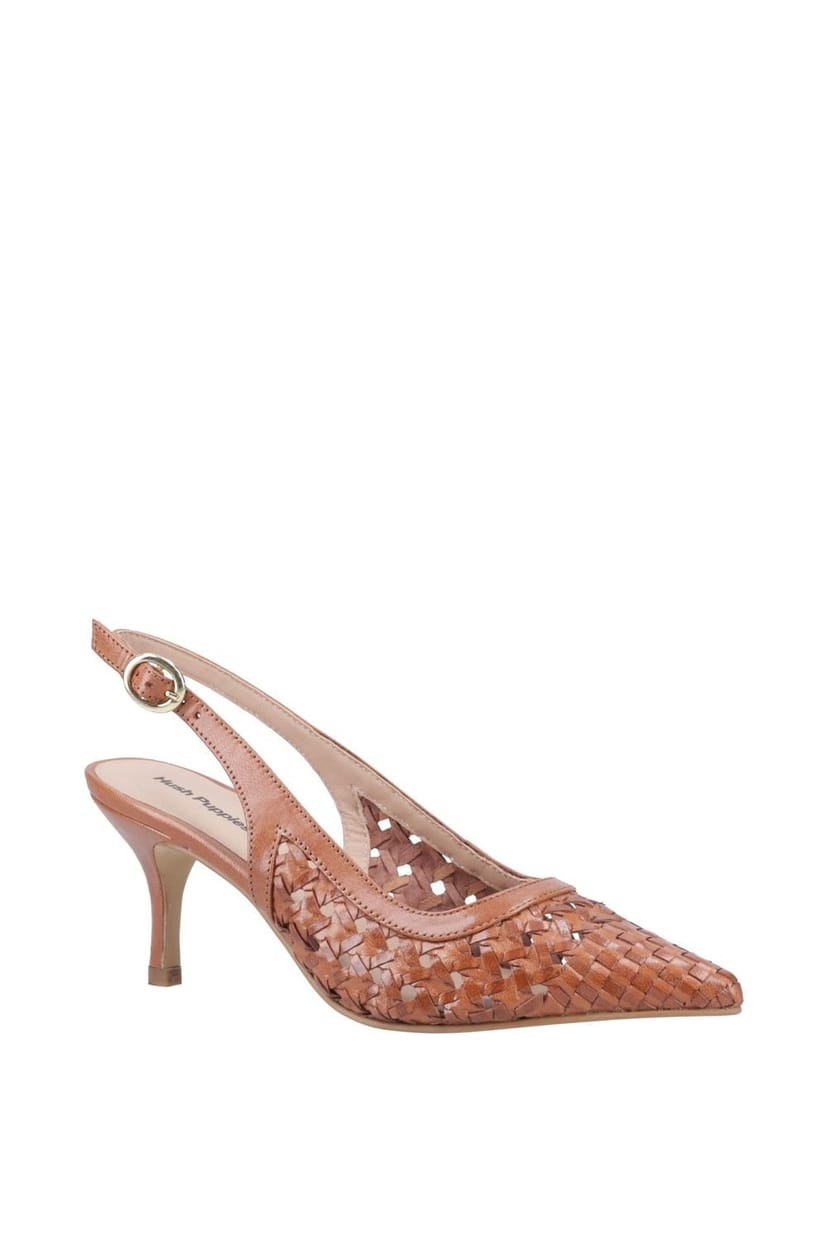 Elegant tan leather kitten heel from Hush Puppies. Featuring a woven leather upper and a memory form insole for all-day comfort. Perfect for summer wear.