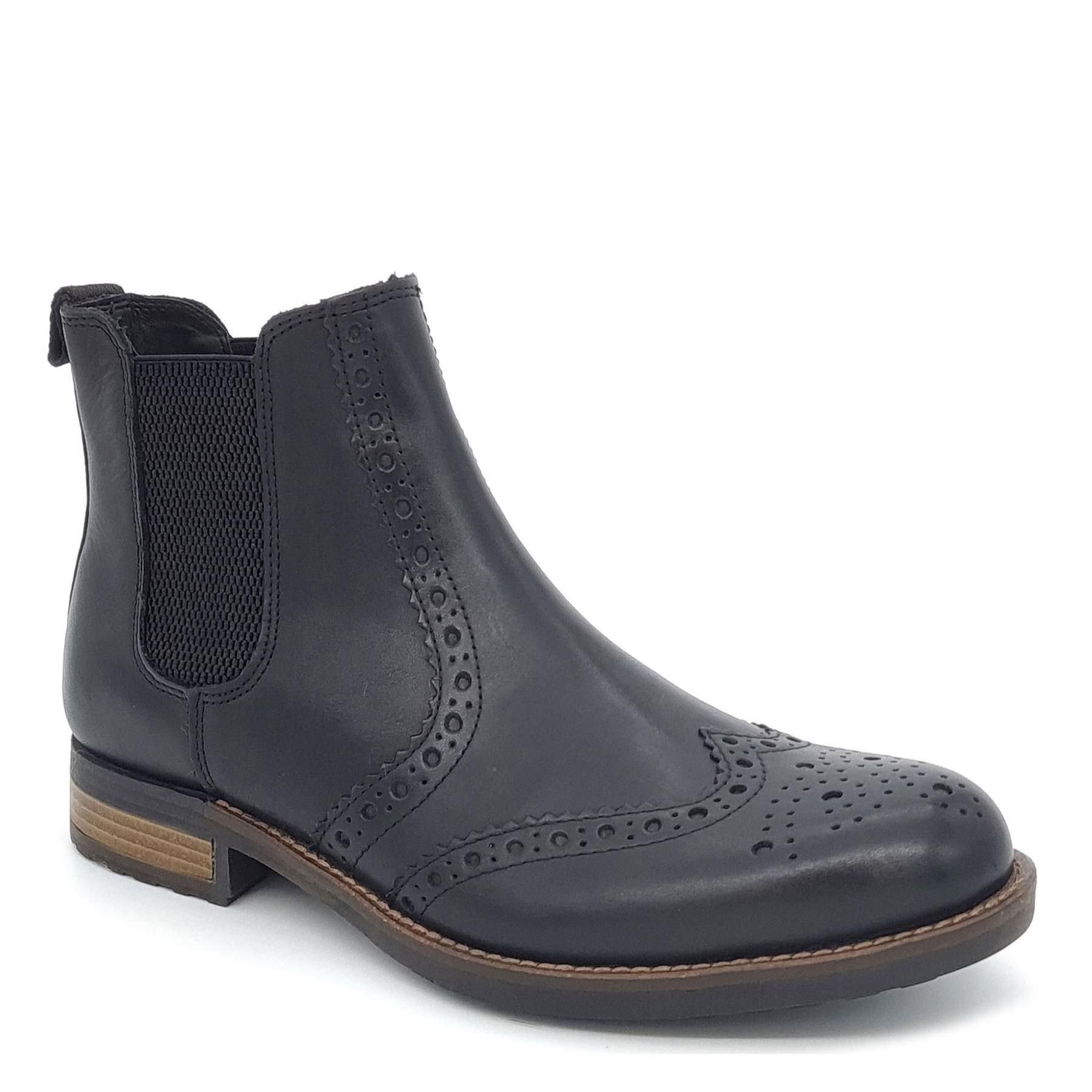 Classic Chelsea boots in black leather with a brogue finish and cleated sole. Perfect for a smart-casual look.