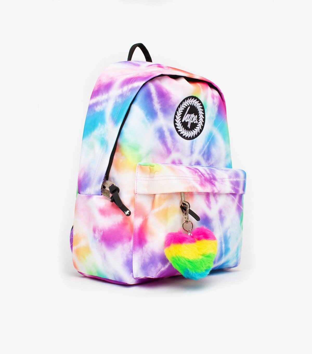 Vibrant multicoloured tie-dye backpack by HYPE. Features adjustable padded straps, a padded laptop sleeve, and a front zip pouch. Ideal for everyday use with its fun heart charm.