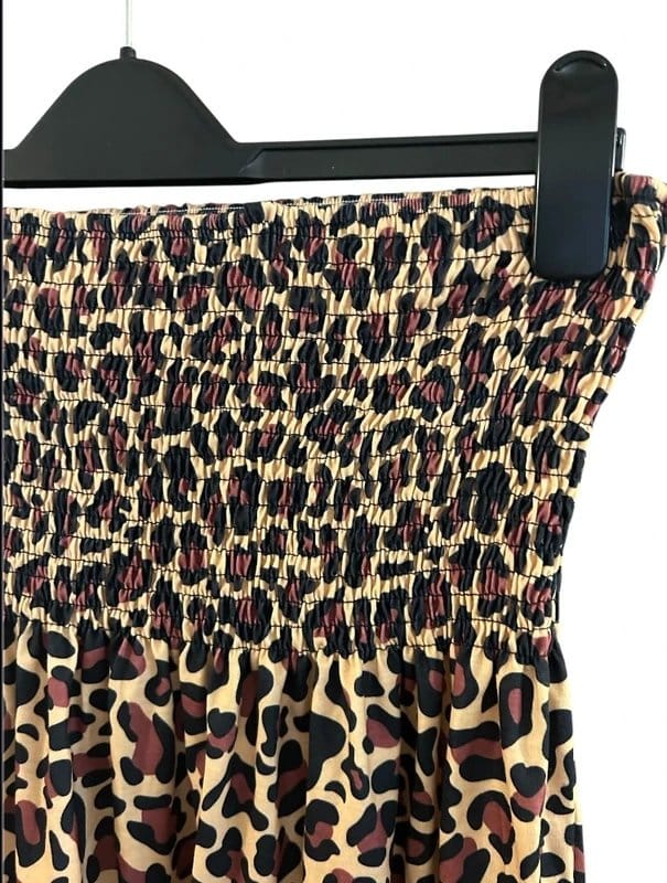 Fierce and fun animal print strapless beach cover-up dress designed for sun-soaked days. Features a flattering elasticated neckline and a breezy fit perfect for layering over swimwear. Lightweight and breathable.