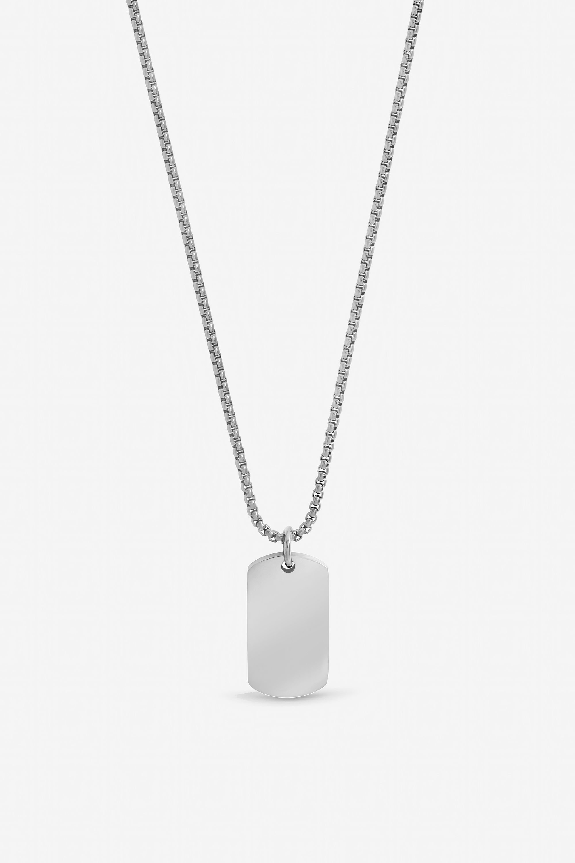 Sleek silver steel dog tag necklace with a waterproof design, perfect for active lifestyles. Minimalist accessory with a bold, contemporary edge.