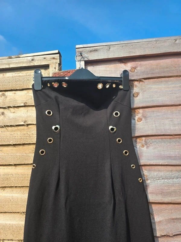 See all outfit ideasElegant black maxi dress by Innovare Denim featuring gold eyelet and chain details. Perfect for evening events or parties.