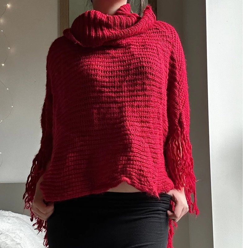Crimson Red Fringed Knit Poncho from Internacionale. This cozy piece is crafted from a chunky, textured knit that provides both warmth and structural interest. The design is defined by a dramatic high turtleneck and a relaxed, draped silhouette that tapers into a playful fringed hemline.