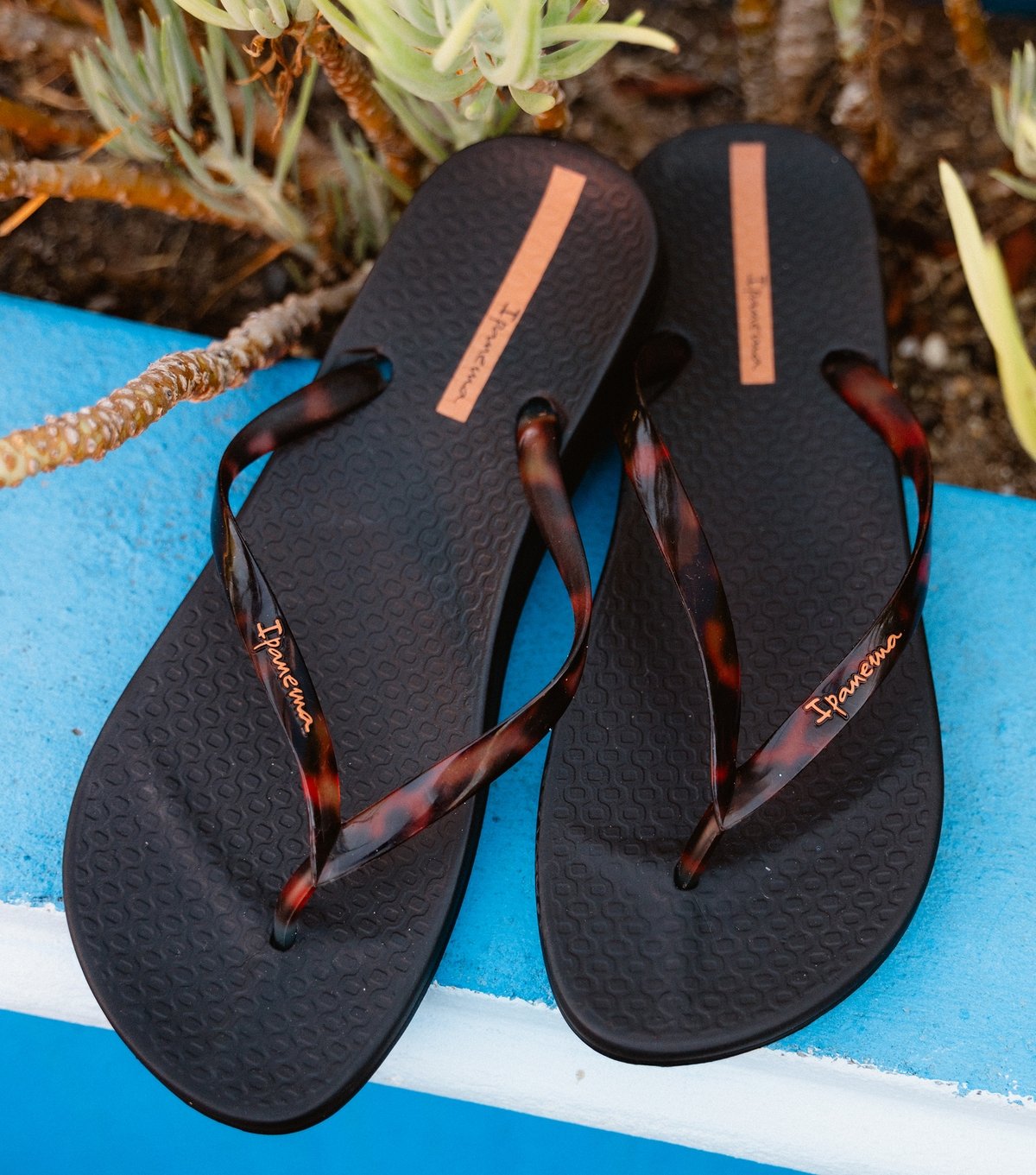Stylish black tortoiseshell flip flops by Ipanema. Perfect for beach days and casual strolls. Lightweight and easy to wear, these sandals offer effortless style this summer.