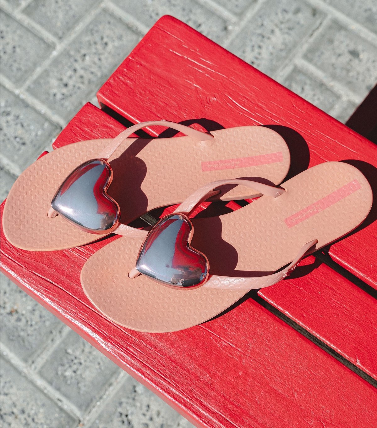 Trendy light pink flip flops with a bold heart-shaped metallic detail. Made from rubber for a comfy everyday fit. Perfect for casual outings and beach days.
