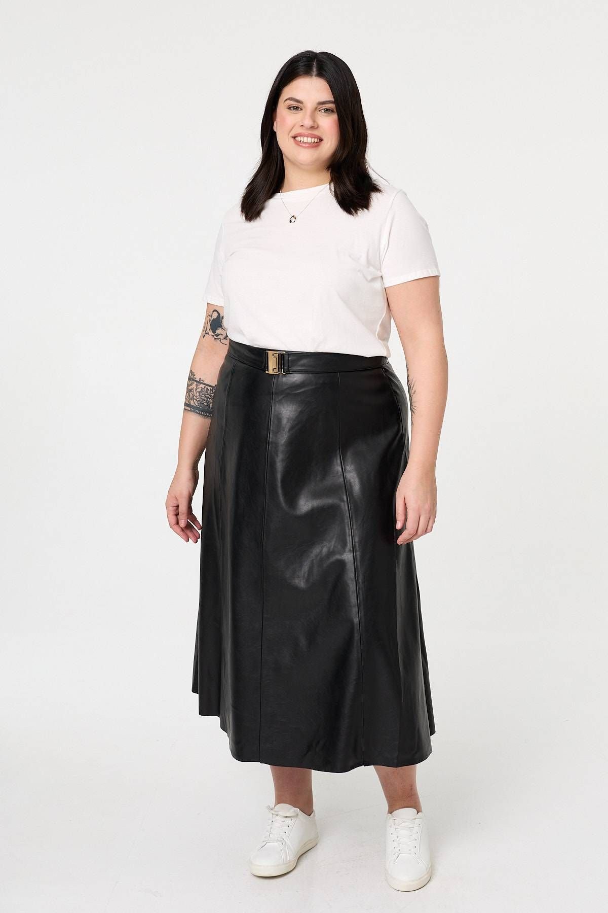 The Izabel Curve Black Faux Leather Belted Midi Skirt is available in sizes 20, 22, 24, 26.