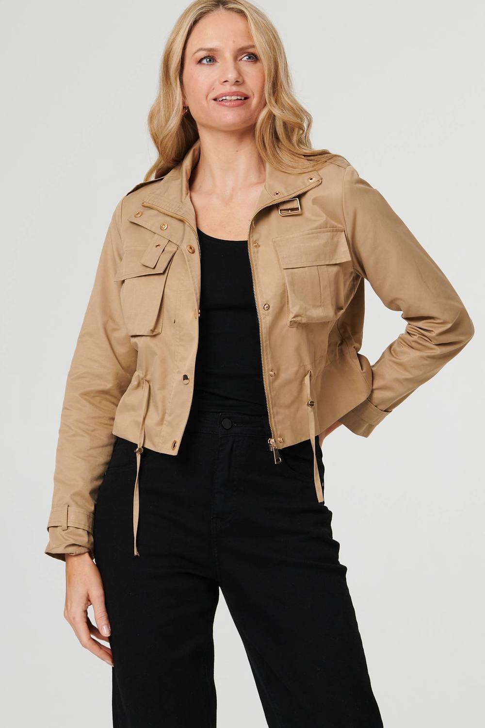 Stylish cropped jacket in beige featuring a high neck with a buckle fastening. It has long sleeves, a flattering cropped fit, and pocket details on the front. The jacket also includes a zip and buttons for closure, and an adjustable drawstring waistband.
