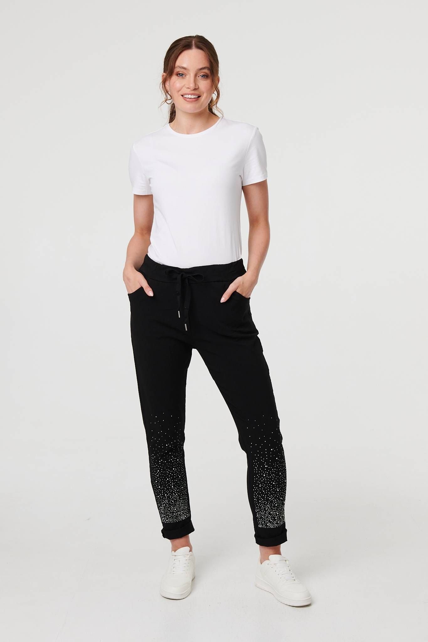 Stylish black slim cropped trousers with a sparkly diamante detail around the turn-up hems. Features a tie waist for a perfect fit and pockets for convenience. Ideal for a casual yet glamorous look.