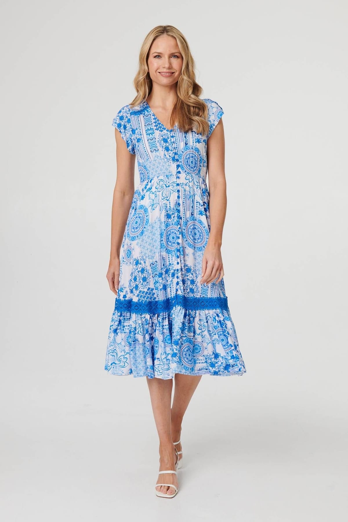 This relaxed summer dress will become a new favourite in your wardrobe. Its made from a soft material and has a relaxed midi skirt for a cool, floaty fit. It also features cap sleeves, a V-neck, and a flattering shirred waist. It's finished with front buttons and lace trims.