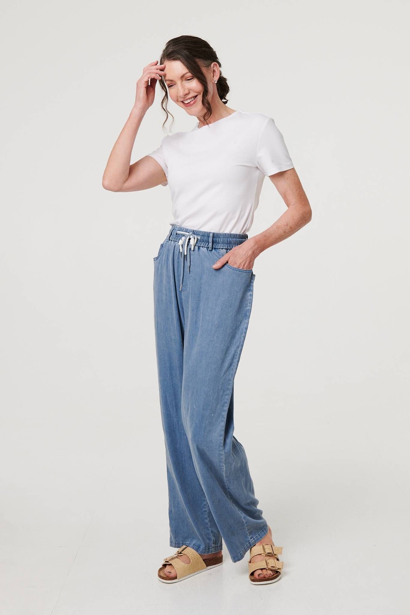 Comfortable and stylish, these blue denim trousers feature a drawstring tie waist and an elasticated waistband. Made from a soft viscose blend, they offer a flattering slim fit and a cropped length for a modern look.
