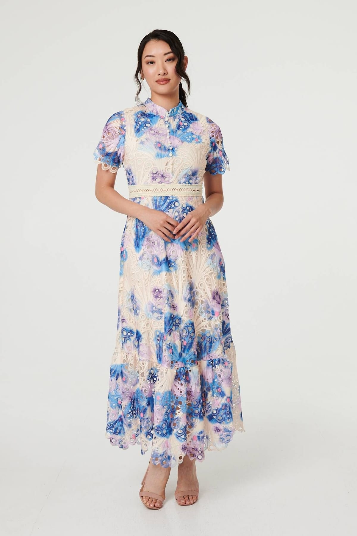 Beautiful maxi dress in blue with a stunning lace textured material. Features cut out details, short sleeves, and an empire waist. The frilled hem and high neck elongate your figure for a feminine look.