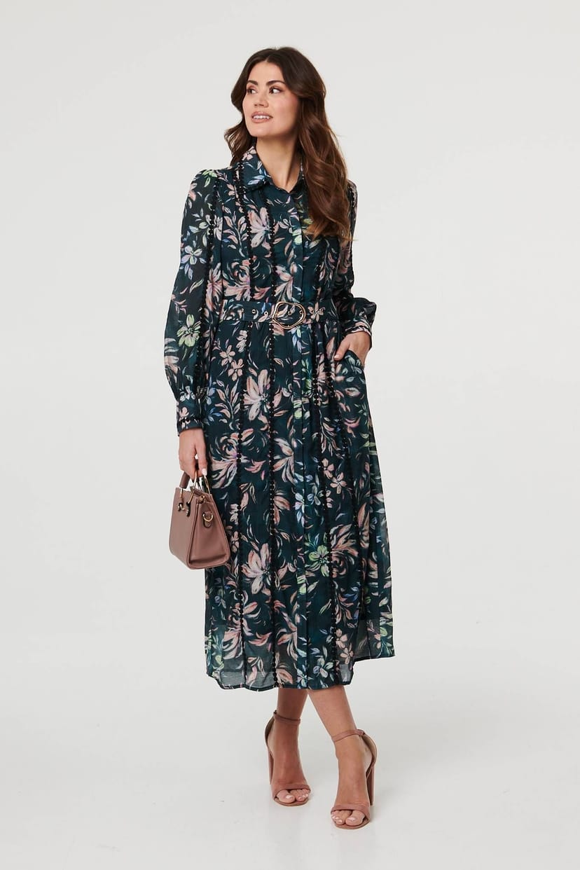 Stylish maxi dress in green floral print with a belted waist and long sleeves. Features a collar, front buttons, and a semi-sheer layered texture. Ideal for work, evenings out, and smart occasions.