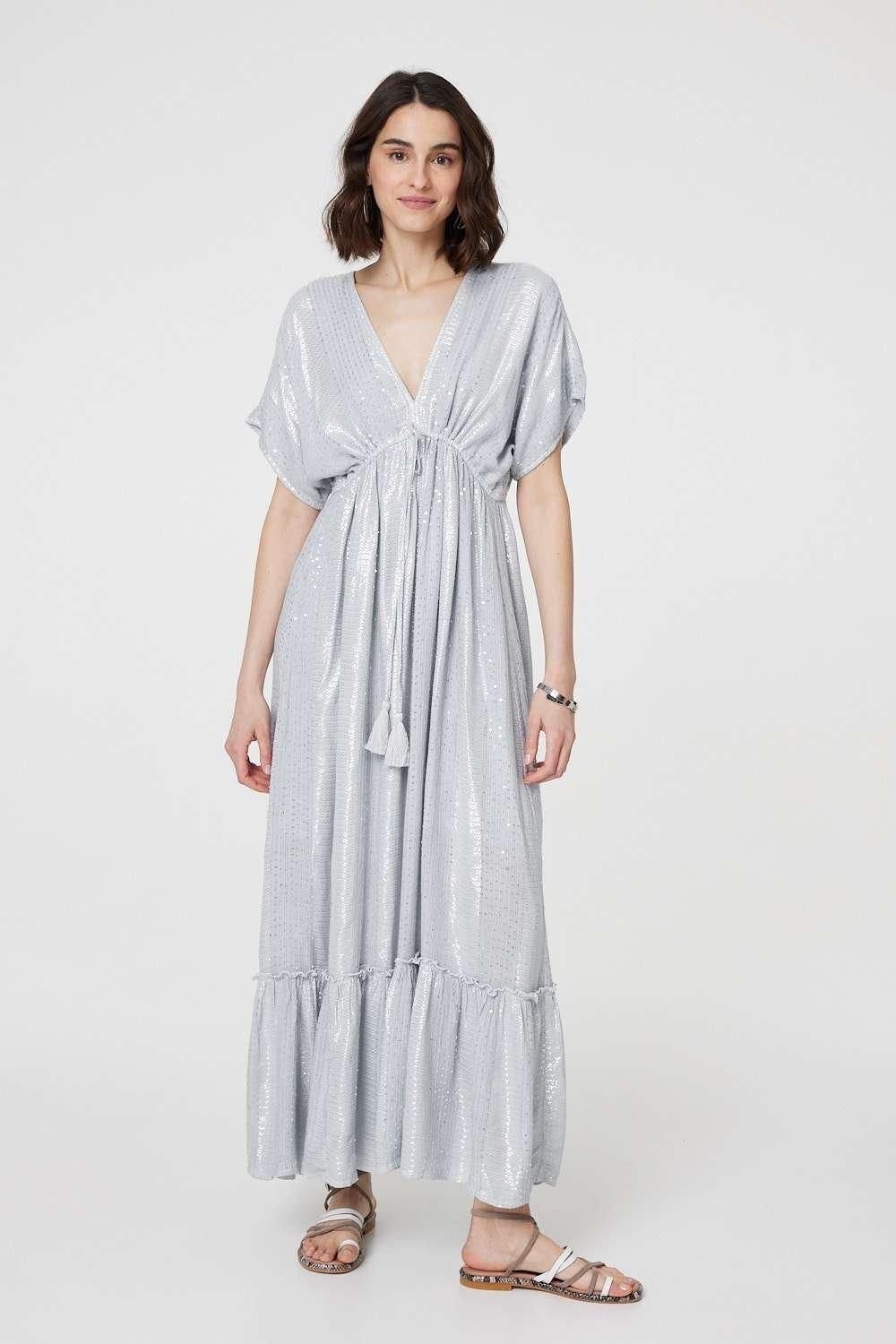 Glamorous maxi dress in grey cotton with a floaty skirt and 1/2 kimono sleeves. Features a flattering empire waist and tassel ties under the bust and on the V-back cutout. Perfect for a cool evening look.
