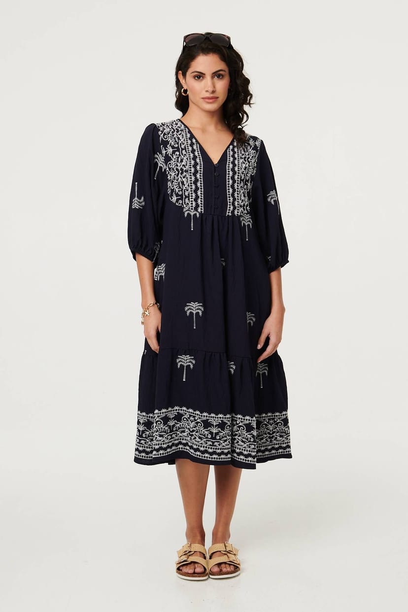 This Navy Border Print Midi Dress by Izabel London features a relaxed tiered shape, 3/4 sleeves, and a V-neckline. The dress is adorned with intricate palm tree prints and front buttons, perfect for an effortless, off-duty look.