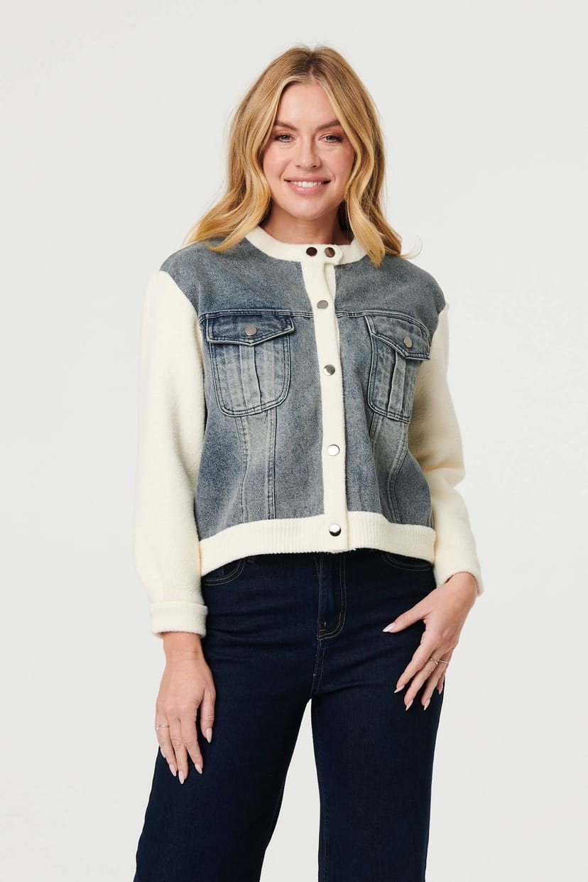 Stylish off-white boxy jacket with denim panel details. Features a round neck, button fastening, and front pocket details. Perfect for a smart casual look.