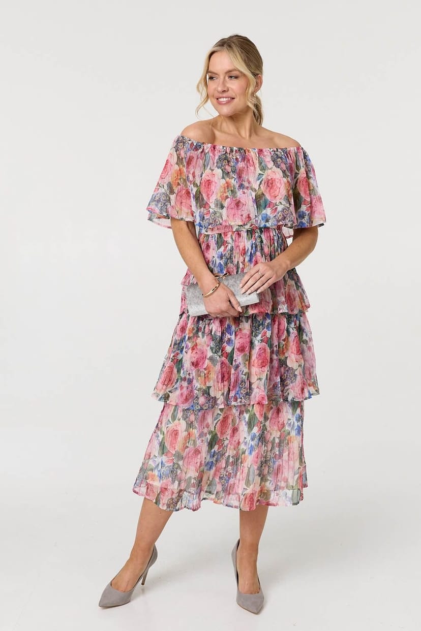 This flattering midi dress is perfect for special occasions and evenings out. It has a floaty tiered shape, with a ruffled semi sheer texture and 1/2 sleeves. The elasticated Bardot top can be adjusted for an off-the-shoulder look. Wear this dress with heeled sandals for a summer night out.