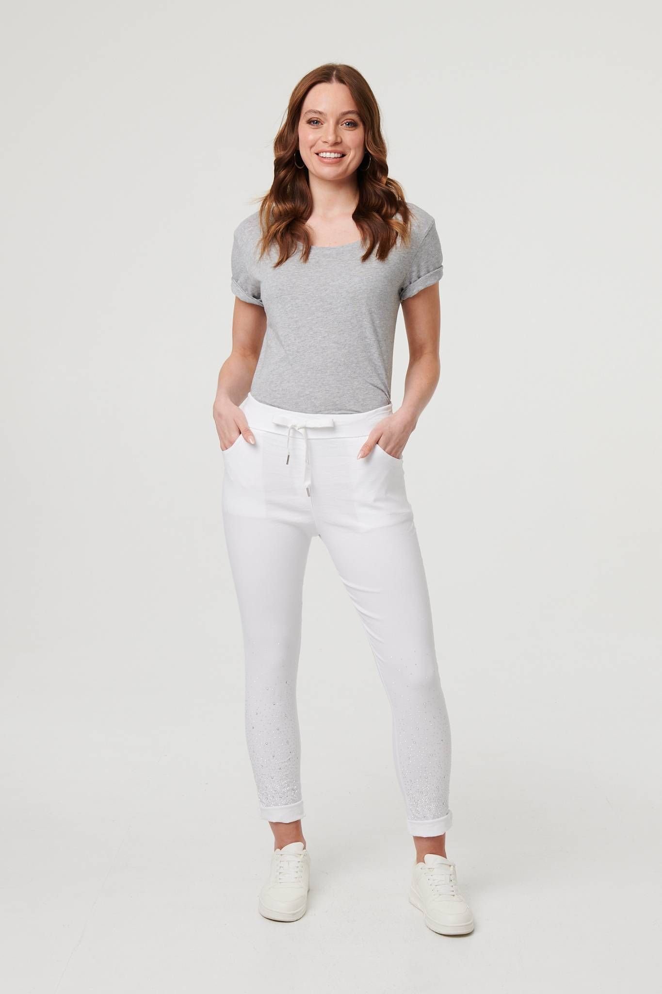Stylish white slim cropped trousers with a sparkly diamante detail around the turn-up hems. They feature a tie waist for a perfect fit and include pockets for convenience. Ideal for a casual yet elegant look.