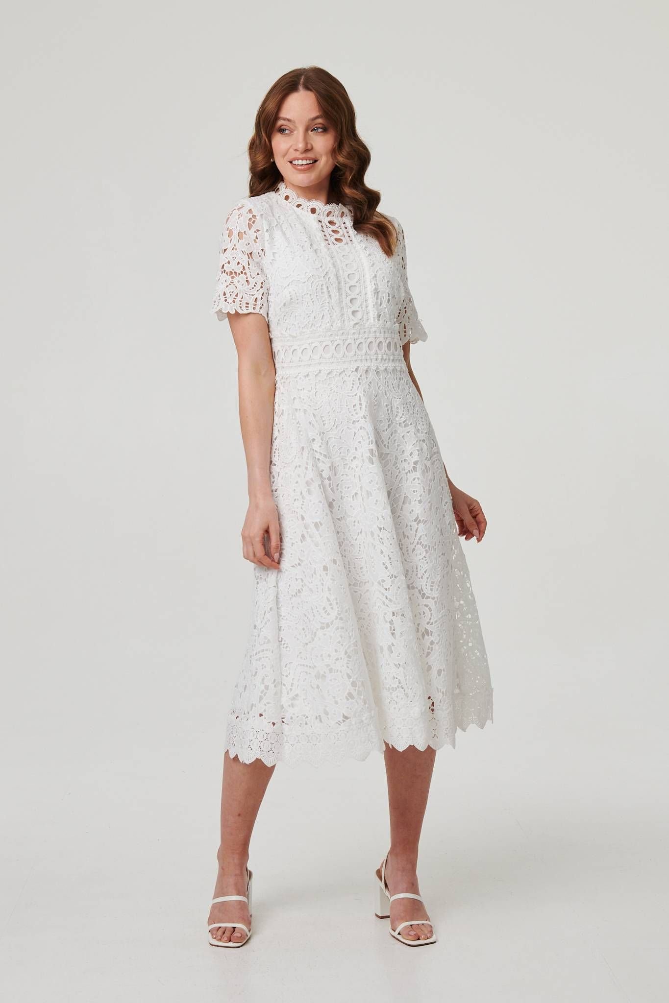 The Izabel London White Lace Midi Dress is ideal for evening, date-night, wedding-guest.