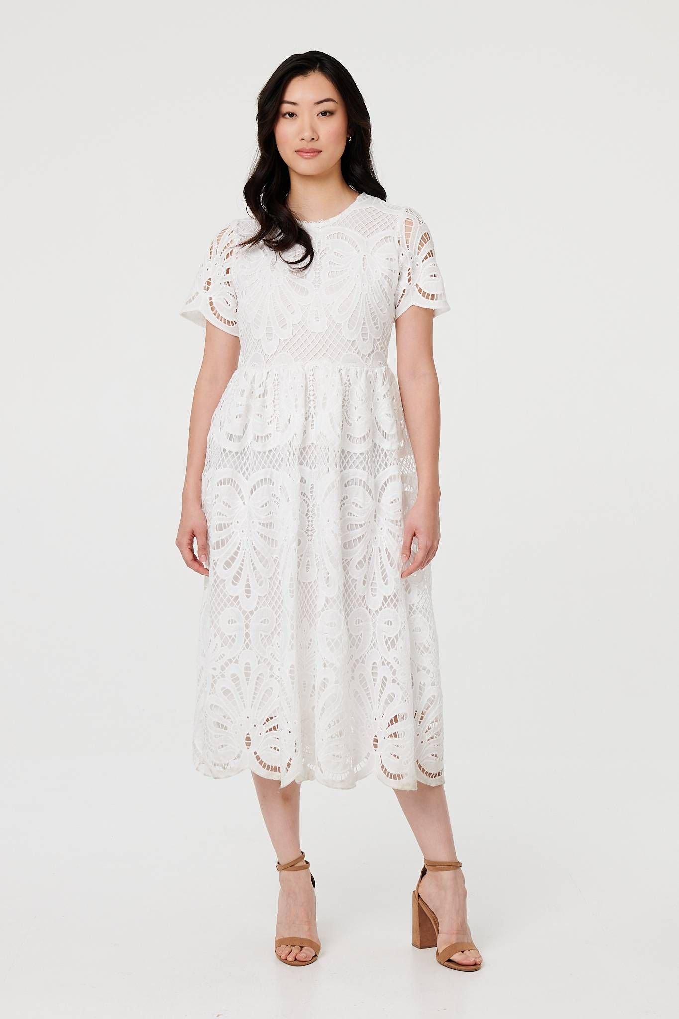 Beautiful midi dress in white lace with intricate cut-out details and a lining underneath. Features short sleeves, a round neck, and a midi length hem. Ideal for formal summer events.