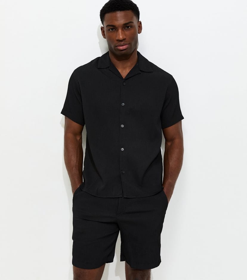 Casual short-sleeve shirt in black with a subtle striped texture. Perfect for summer, this shirt features a drawstring waist for a comfortable fit. Ideal for relaxed, everyday wear.