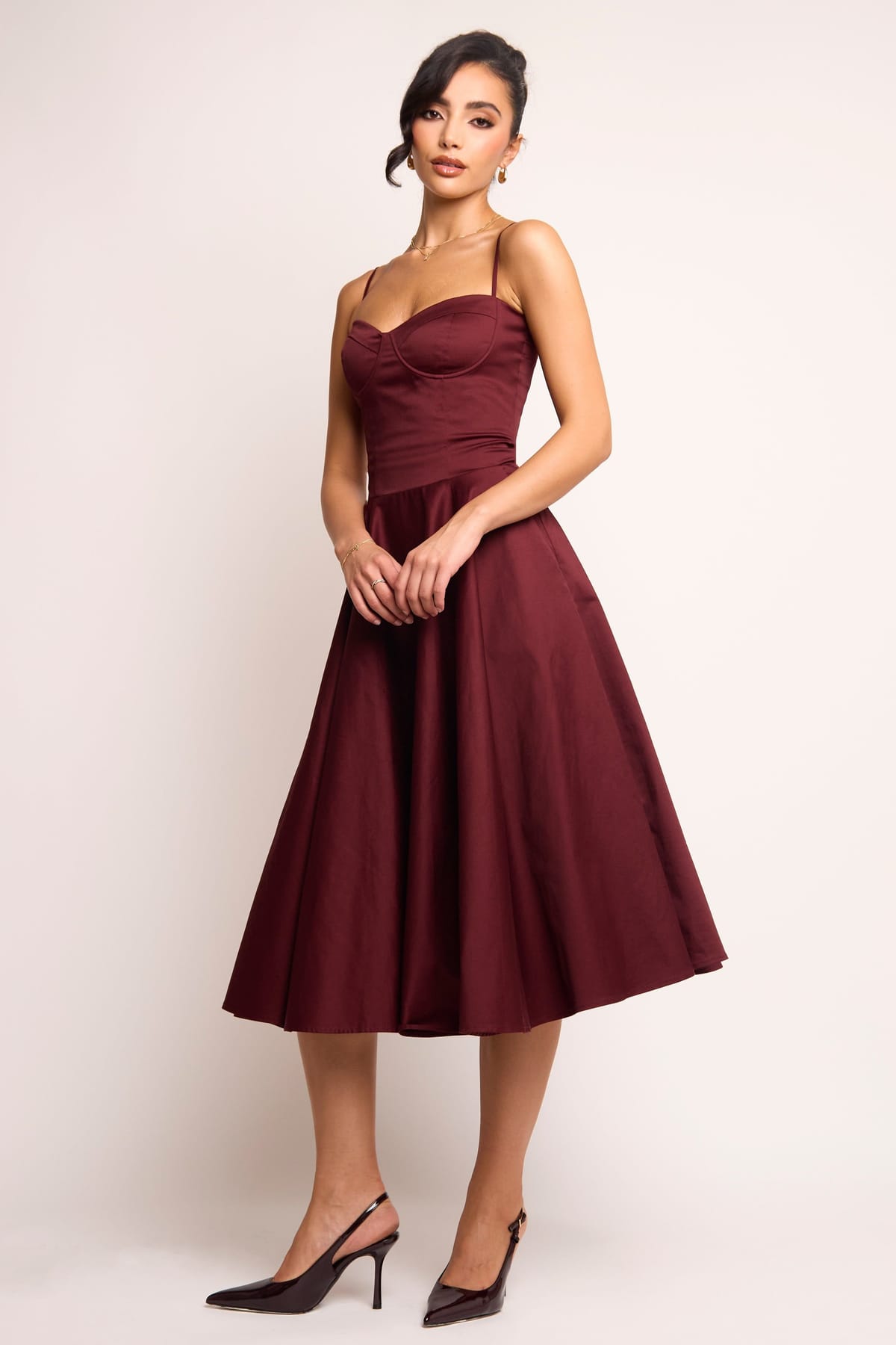 The Jaded Rose Burgundy Corset Midi Dress is ideal for evening, date-night, party.